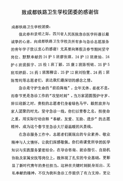 省人民医院急诊医学科在感谢信中高度评价:“志愿者们以青春之名,担使命之重,用实际行动诠释‘奉献、友爱、互助、进步’的志愿精神,成为这个春节里急诊大厅最温暖的风景线。”这份来自临床一线的认可,是对志愿者们最大的褒奖,也是对我校育人成果的最好见证。
