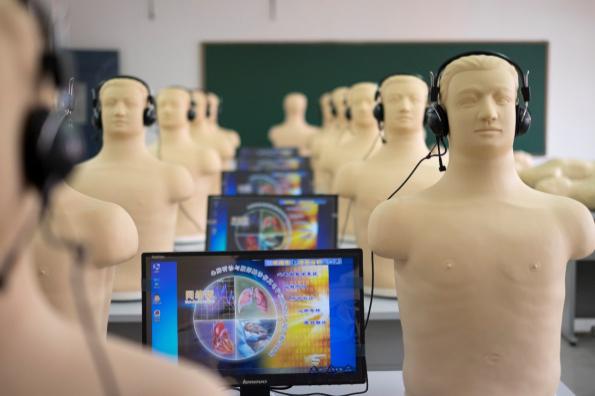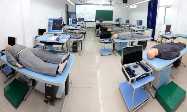 2021年第六届四川省护理技能大赛喻彦琪(左一)、李诗怡(右一)均荣获一等奖 四、校内实训条件 护理专业校内实训基地由基础医学实训中心和护理专业技能实训中心组成,基础医学实训中心与电子科技大学医学院共建,建筑面积1620余m2,设备总值3000余万元,护理专业实训建筑面积2320余m2,实训工位1400个,设有独立的基护实训室、内科实训室、外科实训室、妇产科实训室、儿科实训室、基础实验基地(含解剖、生理、病理、药理、病原微生物、化学等实验室)、老年照护实训基地、母婴照护实训基地等20个专业实训室,配备5个准备室,设备总值2933.2万元。实验实训场地和实训仪器设备配置均满足培养学生职业技能的需要,专业课的实验实训开出率,达到教学计划和大纲规定的95%以上。中心融“教、学、做”为一体,满足培养学生护理职业技能和综合素质的基本需要,通过系统的职业技能训练,加深专业基本理论和专业知识的理解,熟练基础护理和专科护理技术的基本技能,培养学生的临床思维、护患沟通能力与实践操作能力。中心集教学、科研、社会培训和医疗服务于一体,还可为师生开展护理科学研究、老年照护、妇幼保健员从业人员职业技能培训和开展临床护理服务工作提供条件。
