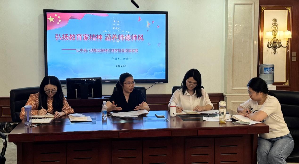研讨结束后,戴晓雪校长结合研讨情况,为全体党员带来了一堂主题为“弘扬教育家精神 涵养师德师风”的精彩党课。党课以中央八项规定精神为引领,强调在学校发展进程中,全体教师要坚守教育初心,深刻领悟教育家精神内涵,将高尚的师德师风融入日常教育教学工作。全体党员教师要以教育家为榜样,坚定理想信念,陶冶道德情操,涵养扎实学识,勤修仁爱之心。他希望党员教师要不断提升自己的专业素养和教学能力,积极探索教育教学改革的新途径、新方法,努力提高人才培养质量,以扎实的工作作风推动学校教育教学质量稳步提升,为学校高质量发展贡献力量。