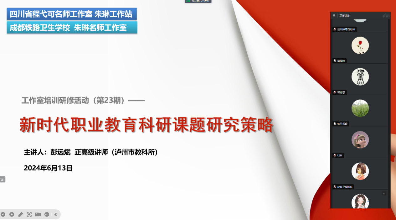 为紧跟国家职业教育改革实施方案,聚焦职业教育科研核心关键,提高我校教师科研能力,朱琳工作室于2024年6月13日邀请泸州市教育科学研究所彭远斌主任,开展了“新时代职业教育科研课题研究策略”线上教学能力提升专题活动。