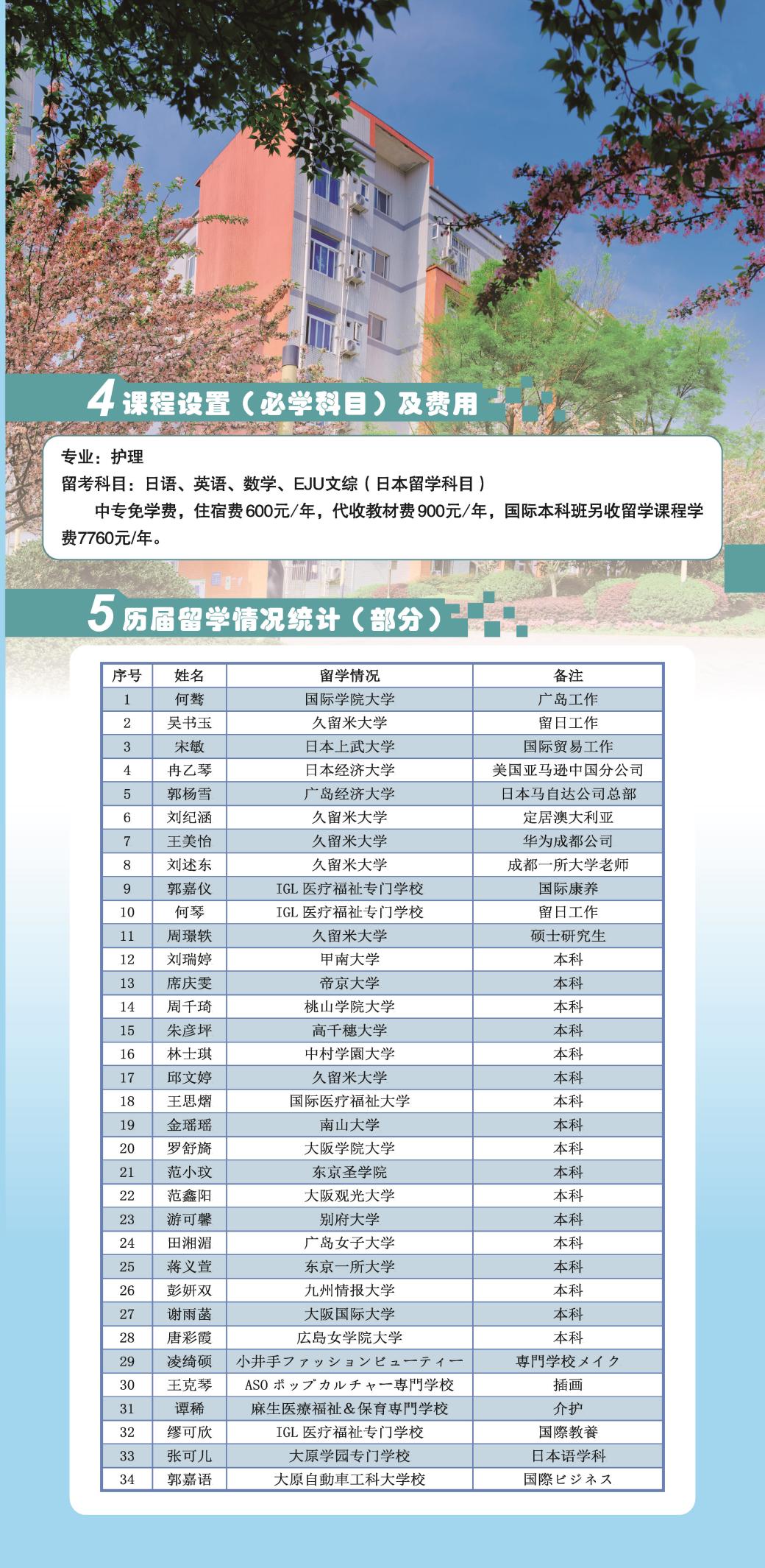 护理(国际班)是学校开办的精品特色专业,培养具备国外继续深造、高层次就业能力和拥有国际视野的高水平人才,已有200余名同学远赴日本读本科、多名学生研究生已毕业。 |