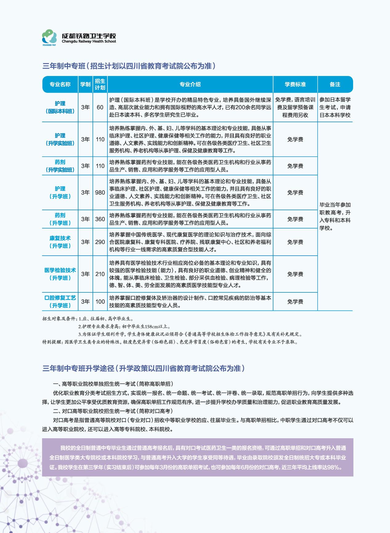 前三年在我校就读,按中专收费(免学费);后两年到四川卫生康复职业学院就读,按照当年校本部高职各专业收费标准执行。 |