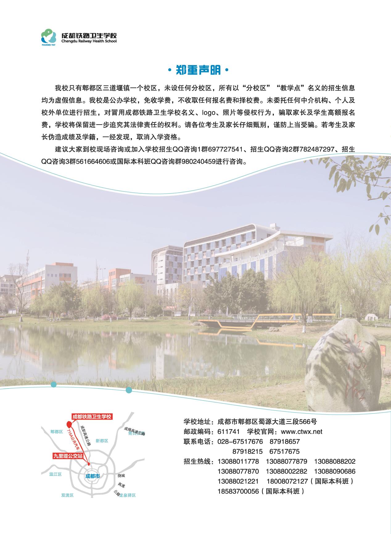 我校只有郫都区三道堰镇一个校区,未设任何分校区,所有以“分校区”“教学点”名义的招生信息均为虚假信息。我校是公办学校,免收学费,不收取任何报名费和择校费。未委托任何中介机构、个人及校外单位进行招生,对冒用成都铁路卫生学校名义、logo、照片等侵权行为,骗取家长及学生高额报名费,学校将保留进一步追究其法律责任的权利。请各位考生及家长仔细甄别,谨防上当受骗。若考生及家长伪造成绩及学籍,冒名顶替,一经发现,取消入学资格。