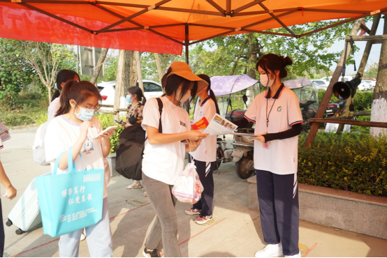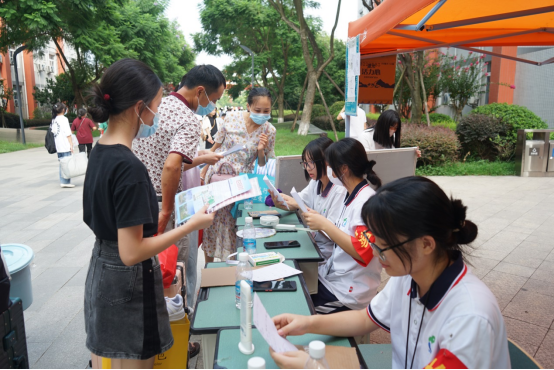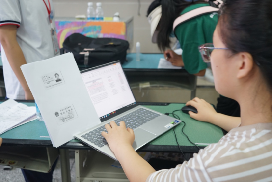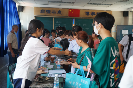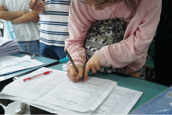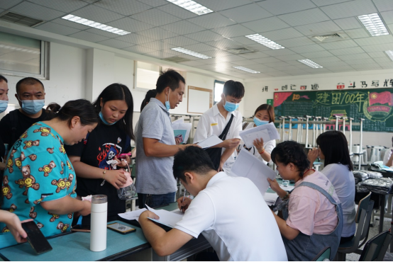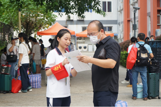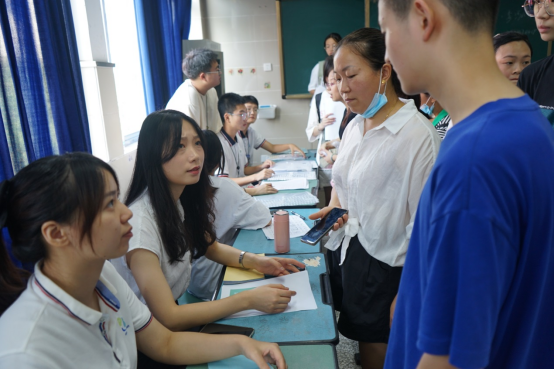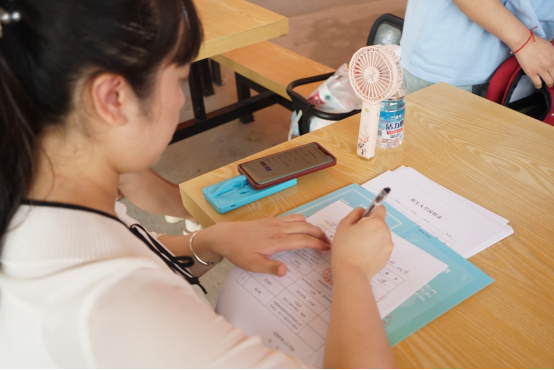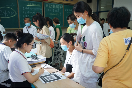 班主任注册处是新生报到的最后一个环节,在这里有不少家长正在咨询问题,新生班主任和志愿者同学有序收取学生的健康卡、体温检测表以及证件复印件,核对完善注册资料,建立班级群,发放军训服装等。