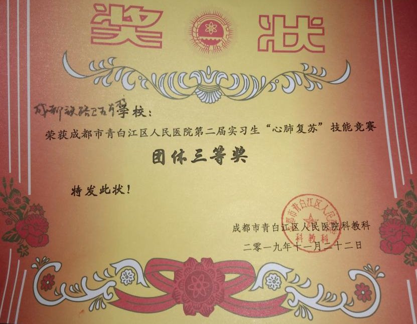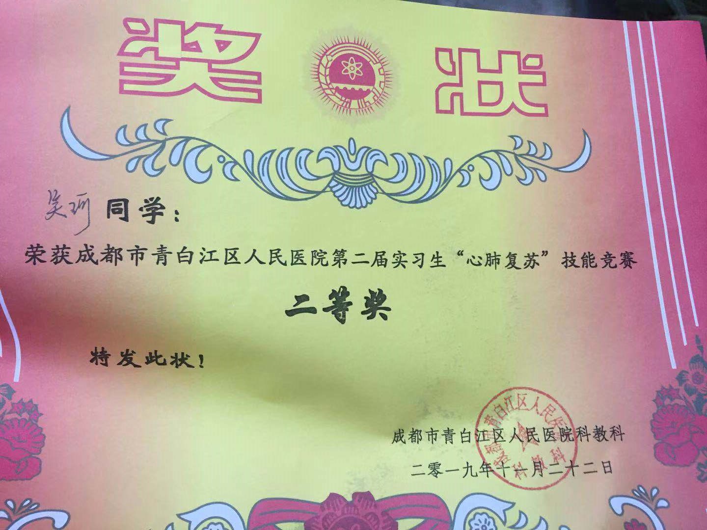 11月22日,青白江区人民医院举办第二届实习生“心肺复苏”技能竞赛。我校实习生在此次竞赛中表现优秀,荣获团体三等奖,其中吴珂同学荣获个人二等奖。