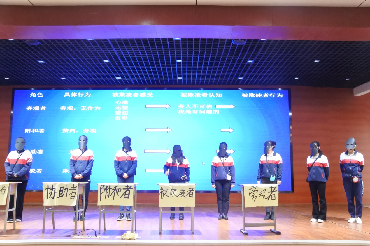 为积极响应学校“安全文明月”活动主题,学校组织开展了“反欺凌、促和谐”专题系列活动。学生科联合心理健康成长中心组织各班开展专题宣传和宣讲活动、主题班会活动,组织问卷调查、情景剧表演和讲座等