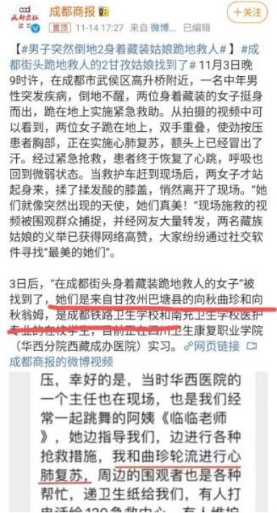 11月3日晚9时,在成都市武侯区高升桥附近,一名中年男性突发疾病,倒地不醒,两位藏族女孩在华西退休的李主任的指导下,挺身而出,跪在地上实施紧急救助。