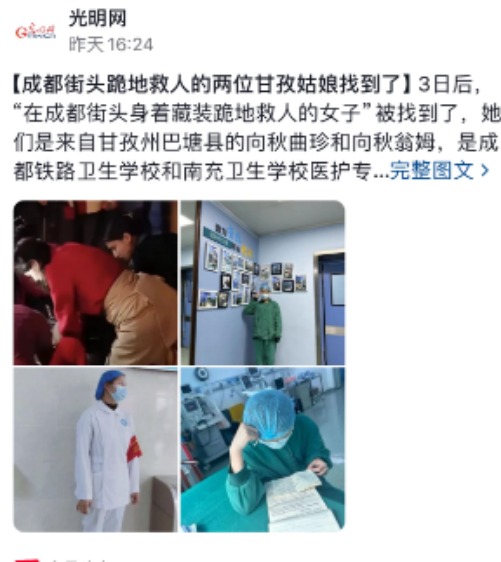 直到救护车赶到现场,两名藏族姑娘护送患者离开后,悄然离开。现场许多见证者对女孩们的行为所感动,将她们乐于助人的事迹拍摄并传播到网上,受到社会各界的一致好评。