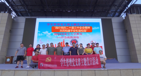 为践行党的二十届三中全会精神,进一步增强我校2024级新生的安全防范意识,将“预防为主,安全第一”的理念融入新生入学教育全过程,提升新生安全防护与应急处理能力,8月27日上午8:30学生管理党支部联合三道堰派出所开展了2024级新生入学教育安全教育及消防应急疏散演练主题党日活动。学校德育副校长唐宏彬、学生管理党支部全体党员、全体教官、2024级全体新生及班主任参加了此次演练活动。