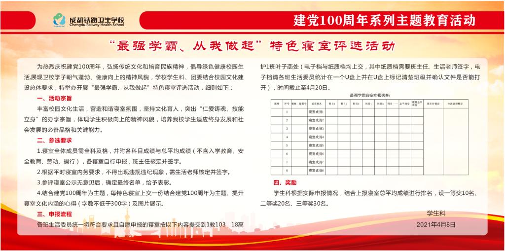 为庆祝建党100周年,弘扬传统文化和培育民族精神,倡导绿色健康校园生活,展现卫校学子朝气蓬勃、健康向上的精神风貌,学校学生科、团委结合校园文化建设总体要求,开展“最强学霸,从我做起”特色寝室评选活动,评选出“最强学霸寝室”共60个。其中一等奖10个,二等奖20个,三等奖30个,并将优秀作品制订成集。