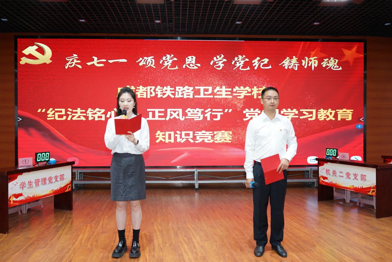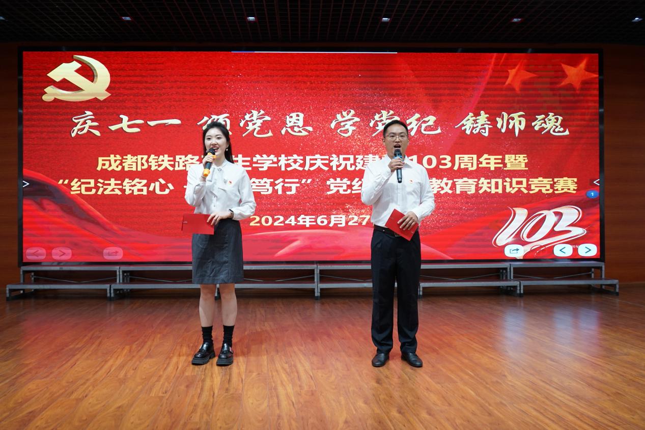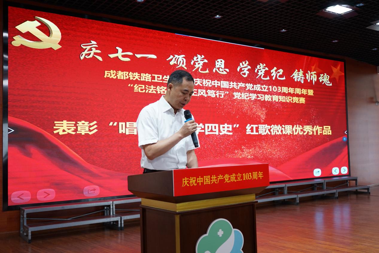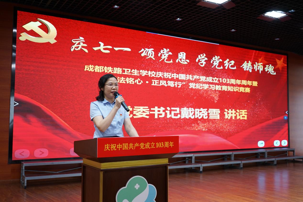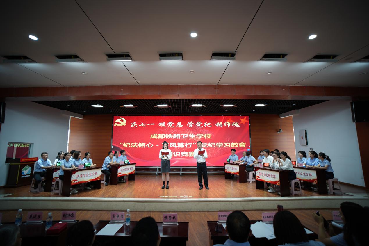 在中国共产党成立103周年即将到来之际,为推动党纪学习教育走深走实,激励全校各党支部和广大党员同志坚定理想信念、永葆对党忠诚的政治本色,6月27日下午,成都铁路卫生学校举行了庆祝建党103周年暨“纪法铭心·正风笃行”党纪学习教育知识竞赛。全校党员教职工、入党积极分子、民主党派、离退休党员和青年学生代表参加了本次活动。