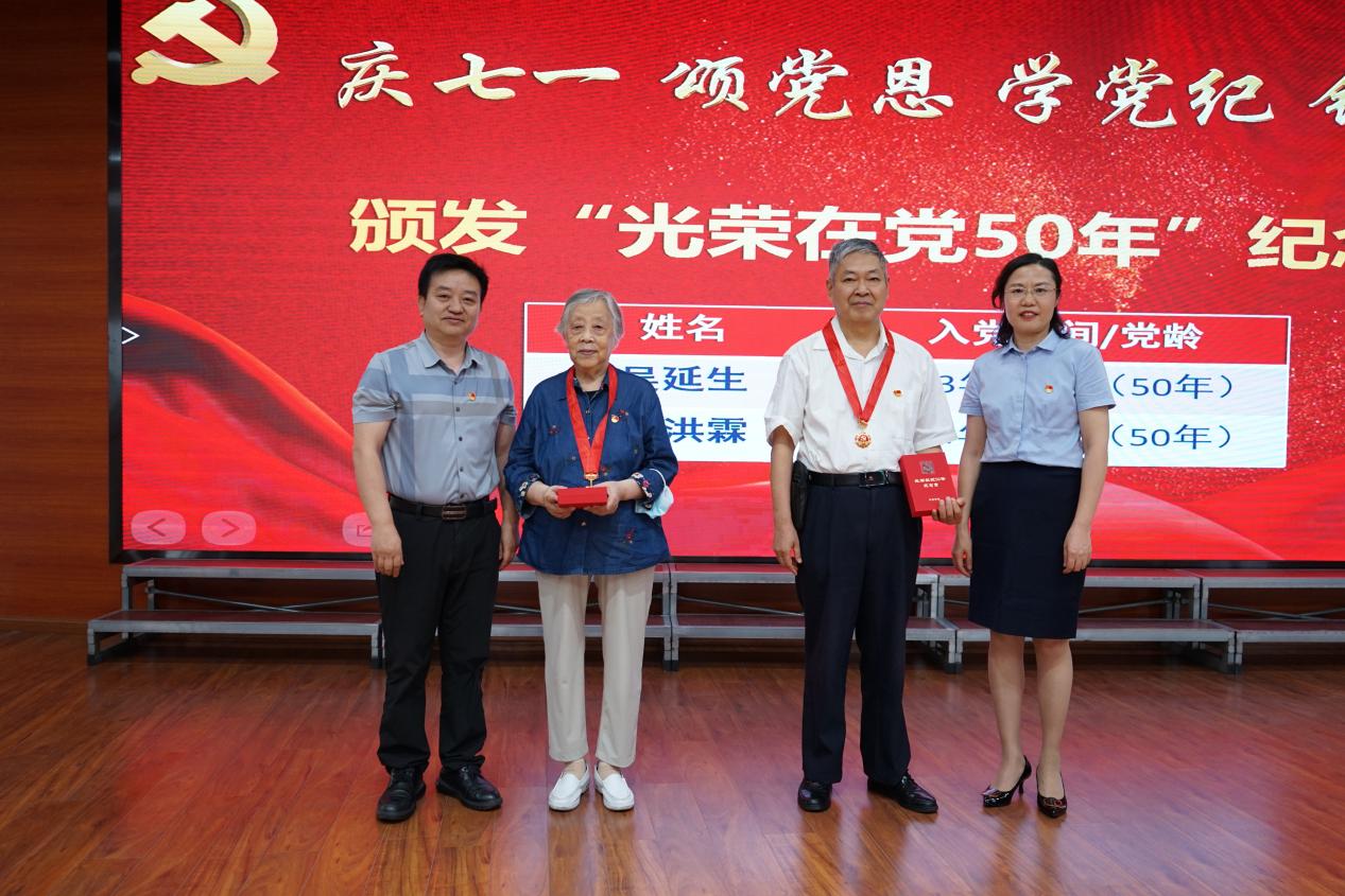 峥嵘五十载,薪火永相传。仪式上,学校党委书记戴晓雪、党委副书记谭崇杭为吴延生同志、谢洪霖同志颁发“光荣在党50年”纪念章,并向他们表示衷心祝贺。这枚纪念章体现了党和人民对长期坚守党的信仰、不懈奋斗的老党员的高度赞誉和深切敬意。更激励了全体党员继续传承和发扬党的优良传统,坚定理想信念,为实现中华民族伟大复兴而不懈努力。