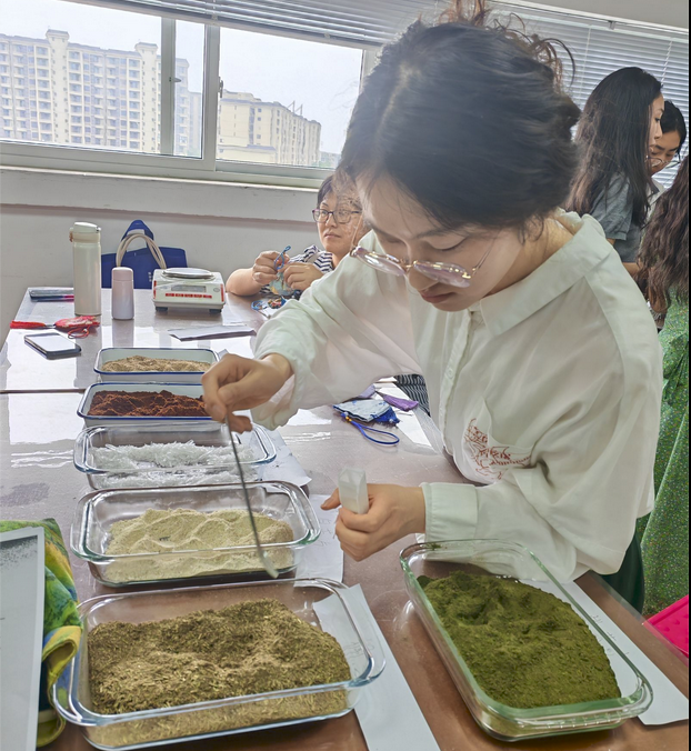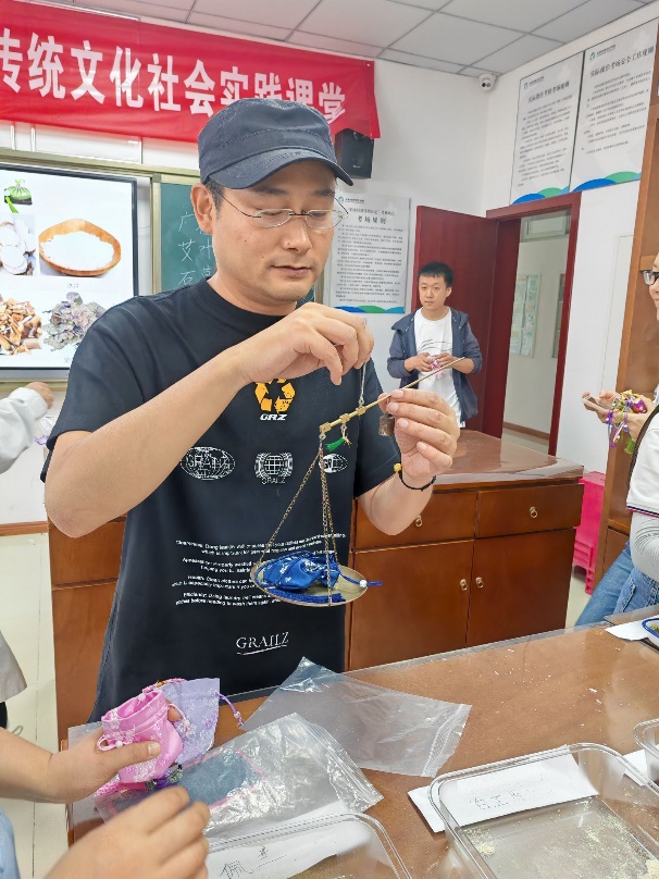 随后,活动进入了互动体验环节。药学社的老师和同学们提前精心准备了丰富的中药材和制作工具,让大家亲自动手体验中药香囊的制作过程。根据讲座学习的内容,老师们学会了如何挑选药材、如何搭配和称取香料、如何制作香囊等技巧。大家一边制作香囊,一边交流心得,现场气氛热烈而温馨。不一会儿,一个个造型精美、色彩鲜艳的香囊便制作完成。这些香囊不仅具有观赏价值,更承载着大家对端午节传统文化的热爱和传承。