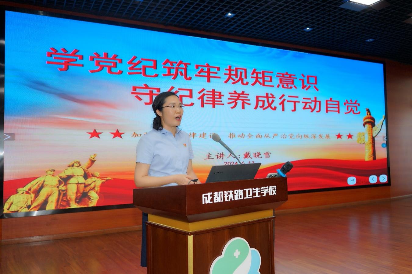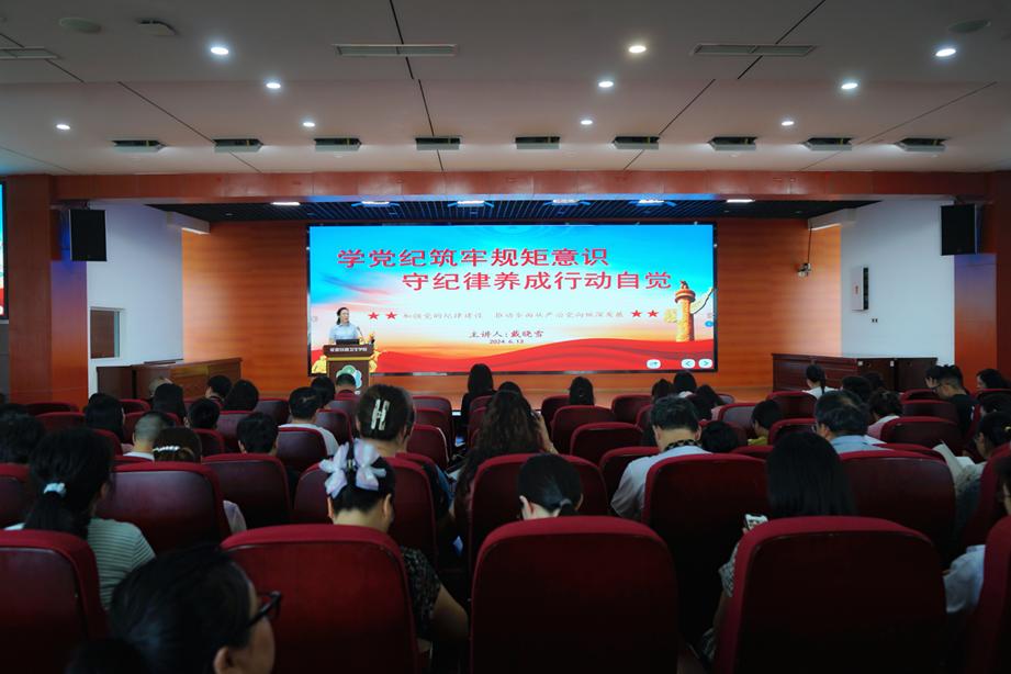 为扎实开展党纪学习教育,增强党员干部纪律意识和规矩意识,6月13日,学校党委书记戴晓雪以《学党纪筑牢规矩意识, 守纪律养成行动自觉》为题讲授党纪学习教育专题党课。学校无课党员教职工、中层干部、入党积极分子等参加会议。