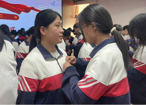 授予团员标志,老团员为新团员代表佩戴团徽。