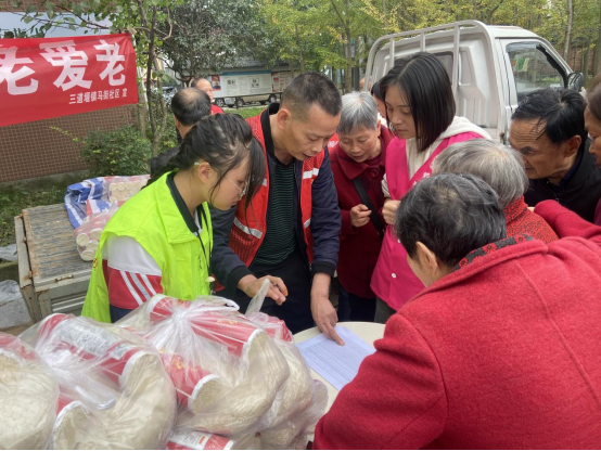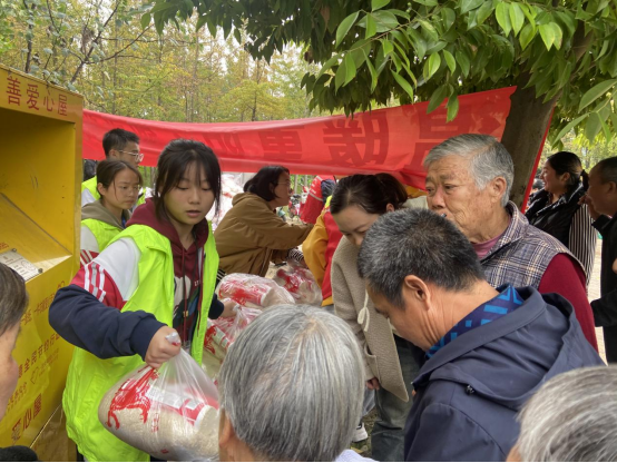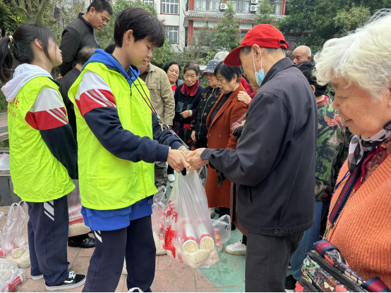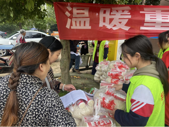 在重阳节来临之际,我校公益社的志愿者们与马街社区党组织给社区老人送温暖。志愿者们用最诚挚的笑容,带着最亲切的问候,将准备的米面粮食分发到每一位老人手中,志愿者们还为部分行动不便的老人送慰问品到家里。