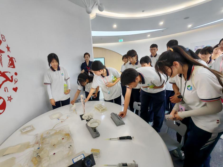 进入第二展厅,同学们通过触摸血液检验用品、观看血液检验流程等活动,了解认识一袋血的旅程,即为血液采集、检测、制备、储存流程,见证了一个生命走向另一个生命。随后进入第三展厅,同学们在虚拟场景体验中,了解无偿献血过程。