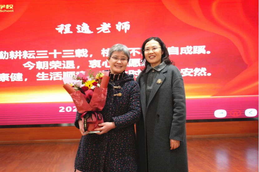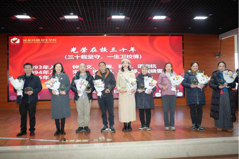 在温馨感人的“光荣在校三十年”致敬仪式中,学校副校长、工会主席唐宏彬宣读三十年教龄教职工名单,并为他们颁发纪念奖杯,青年教师代表献上鲜花,现场掌声不断,气氛庄重而温暖。