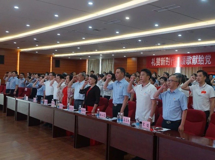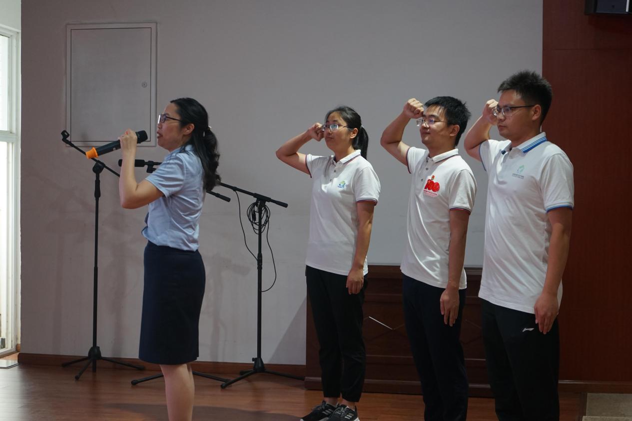 党委书记戴晓雪同志带领3名新党员面向党旗,庄严宣誓。在场全体党员重温入党誓词。