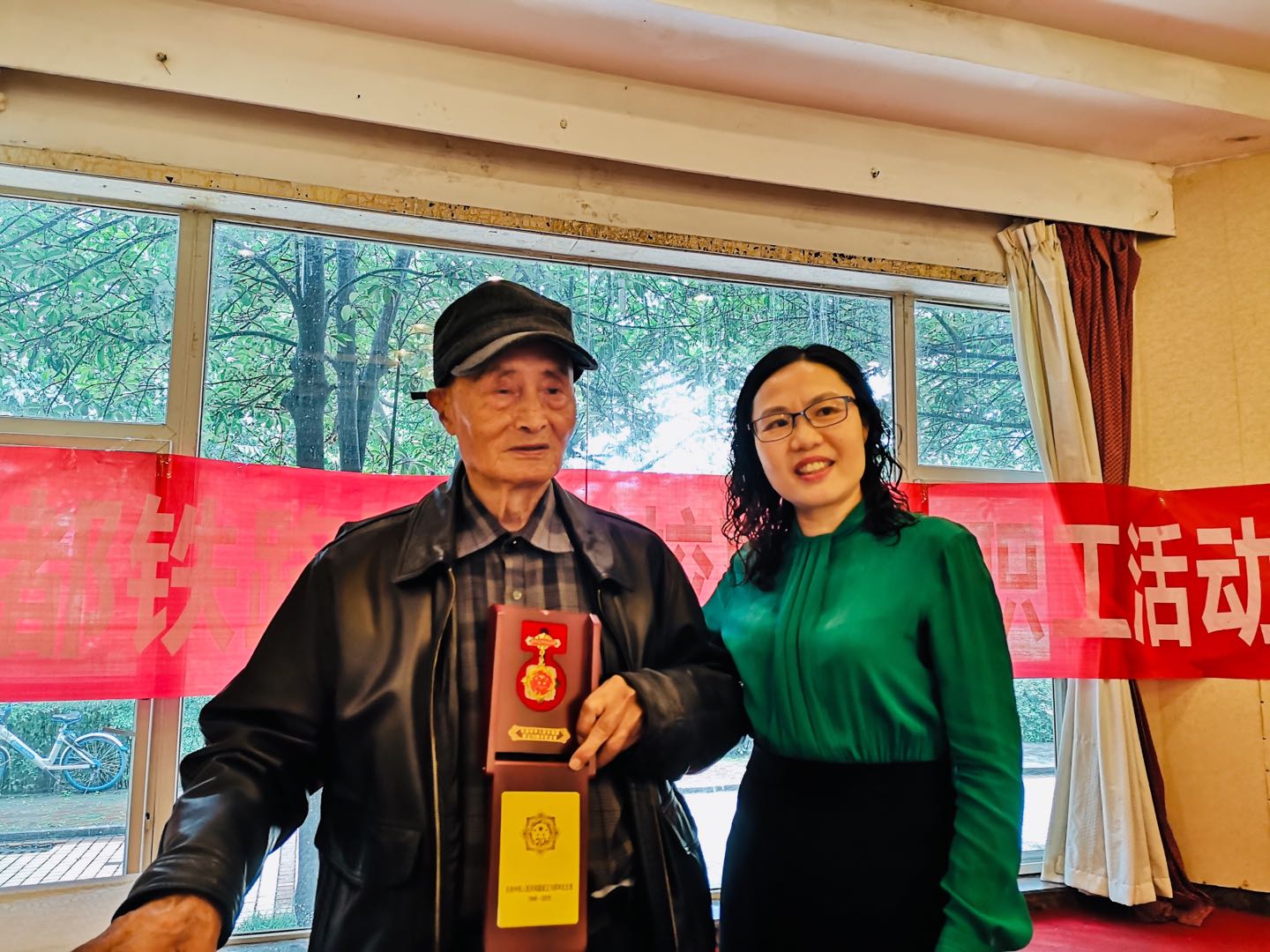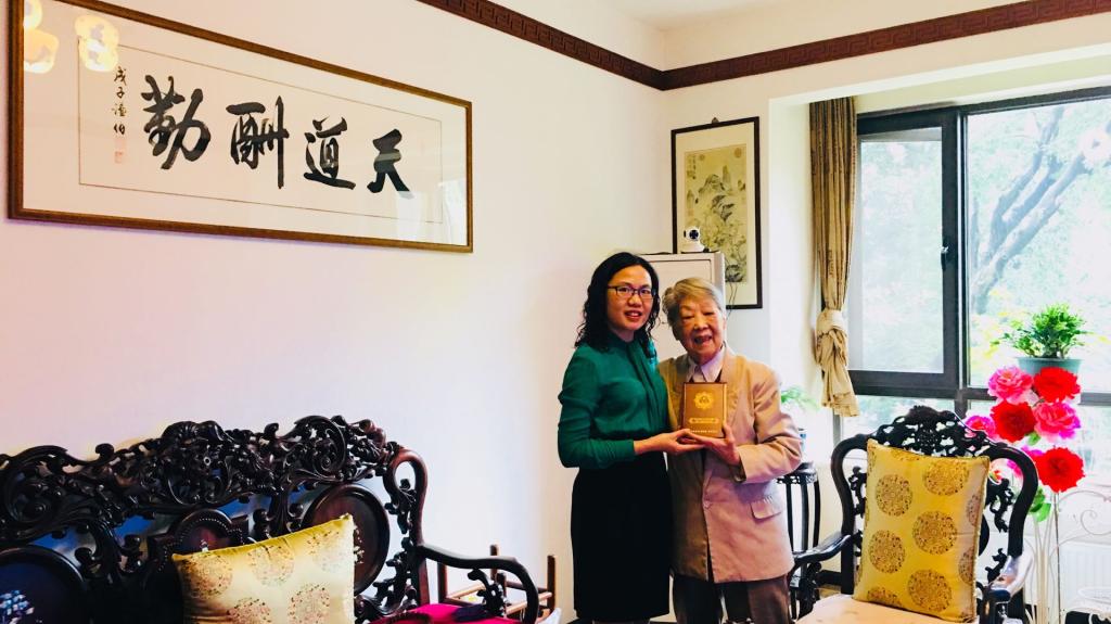 学校党委书记戴晓雪为离休干部沈凌颁发建国70周年纪念章