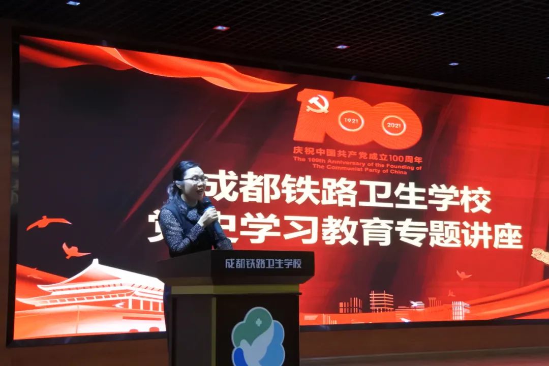 在建党100周年之际,为了认真学习贯彻习近平总书记在党史学习教育动员大会上的重要讲话精神,扎扎实实开展学习教育,进一步提高新时代教育人的政治素养,在教育教学过程中,为同学们讲好党的故事、革命的故事、英雄的故事,引导他们听党话、跟党走。成都铁路卫生学校邀请了四川师范大学马克思主义学院兰夕雨副教授于2021年6月3日下午在学校科技信息楼六楼开展党史学习教育专题培训。学校全体领导班子成员及教职工参加了本次培训。